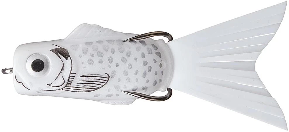 Its realistic, injured panfish profile, complete with rubber tail-like skirting material and baitfish color patterns, creates a highly visual and enticing lure. The cupped mouth produces loud popping sounds on the strike, while the chugging action on the retrieve draws attention from distant fish too!